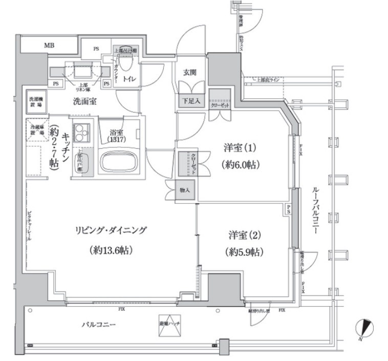 部屋詳細 洋室(6帖) 洋室(5.9帖) LD(13.6帖) K(2.7帖) 所在階 10階