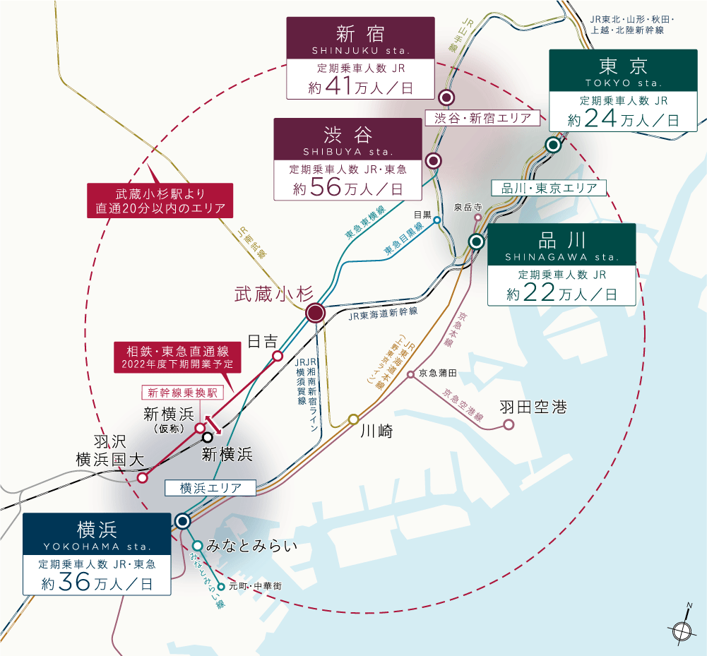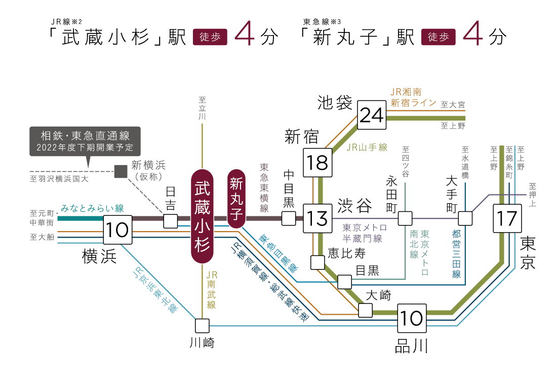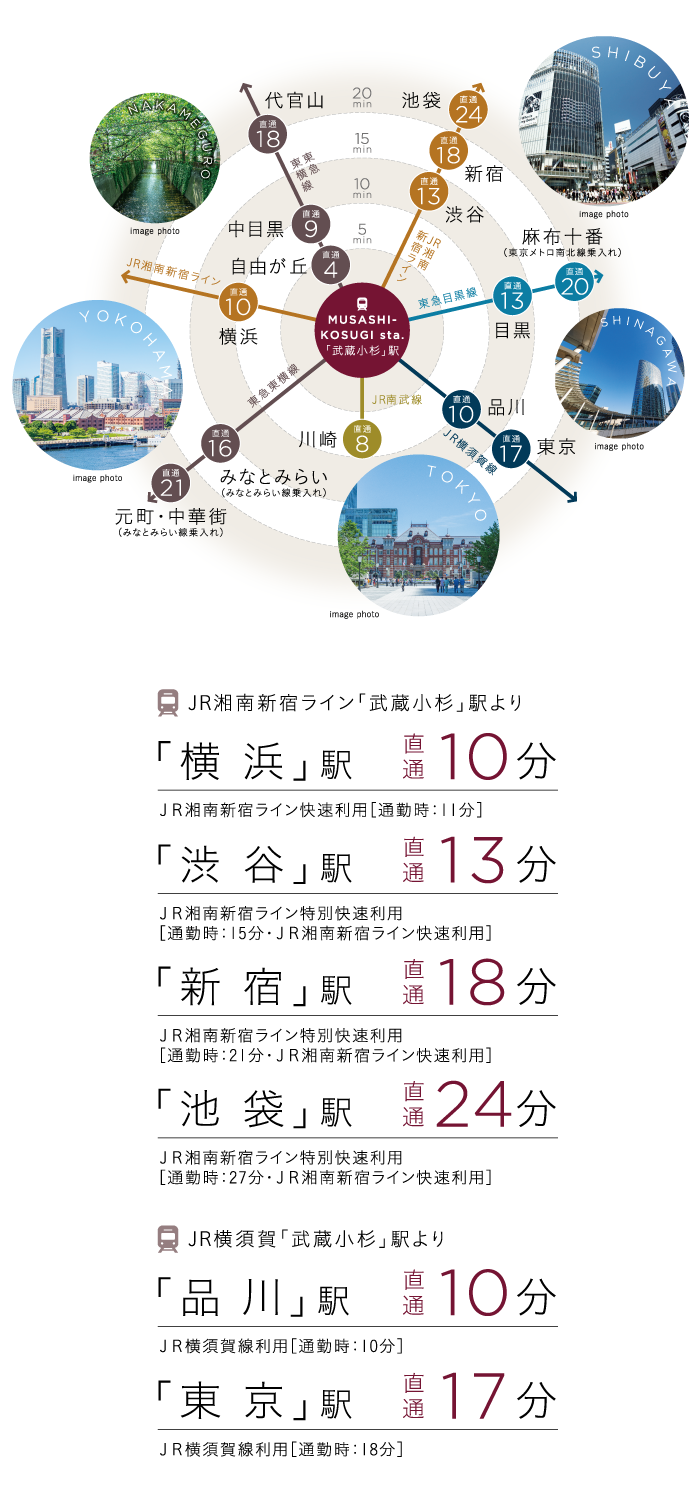 ※1.「14路線」とは、JR南武線、JR横須賀線、JR湘南新宿ライン、相鉄・JR直通線、東急東横線、東急目黒線、東京メトロ副都心線(東急東横線乗入れ)、みなとみらい線(東急東横線乗入れ)、東武東上線(東急東横線乗入れ)、西武有楽町線(東急東横線乗入れ)、西武池袋線(東急東横線乗入れ)、東京メトロ南北線(東急目黒線乗入れ)、都営三田線(東急目黒線乗入れ)、埼玉高速鉄道(東急目黒線乗入れ)を表現したものです。※2.「JR線」とは、JR南武線です。JR横須賀線・湘南新宿ライン・成田エクスプレス「武蔵小杉」駅横須賀線口まではさらに徒歩7分要します。※3.「東急線」とは、東急東横線・目黒線です。●JR南武線利用/「川崎」駅へ8分(JR南武線快速利用)[通勤時13分]●東急東横線利用/「自由が丘」駅へ4分(東急東横線Fライナー特急利用)[通勤時6分(東急東横線通勤特急利用)]、「中目黒」駅へ9分(東急東横線Fライナー特急利用)[通勤時13分(東急東横線通勤特急利用)]、「代官山」駅へ18分[通勤時20分]、「みなとみらい」駅へ16分(東急東横線Fライナー特急利用※みなとみらい線乗入れ)[通勤時19分(東急東横線通勤特急利用※みなとみらい線乗入れ)]、「元町・中華街」駅へ21分(東急東横線Fライナー特急利用※みなとみらい線乗入れ)[通勤時23分(東急東横線急行利用※みなとみらい線乗入れ)]●東急目黒線/「目黒」駅へ13分(東急目黒線急行利用)[通勤時17分(東急目黒線急行利用)]、「麻布十番」駅へ20分(東急目黒線急行利用※東京メトロ南北線乗入れ)[通勤時24分(東急目黒線急行利用※東京メトロ南北線乗入れ)]※掲載の所要時間は、日中平常時・[]は通勤時のもので乗換・待ち時間を含みません。また、時間帯により異なります。※掲載のアクセス情報は2020年6月現在のものです。